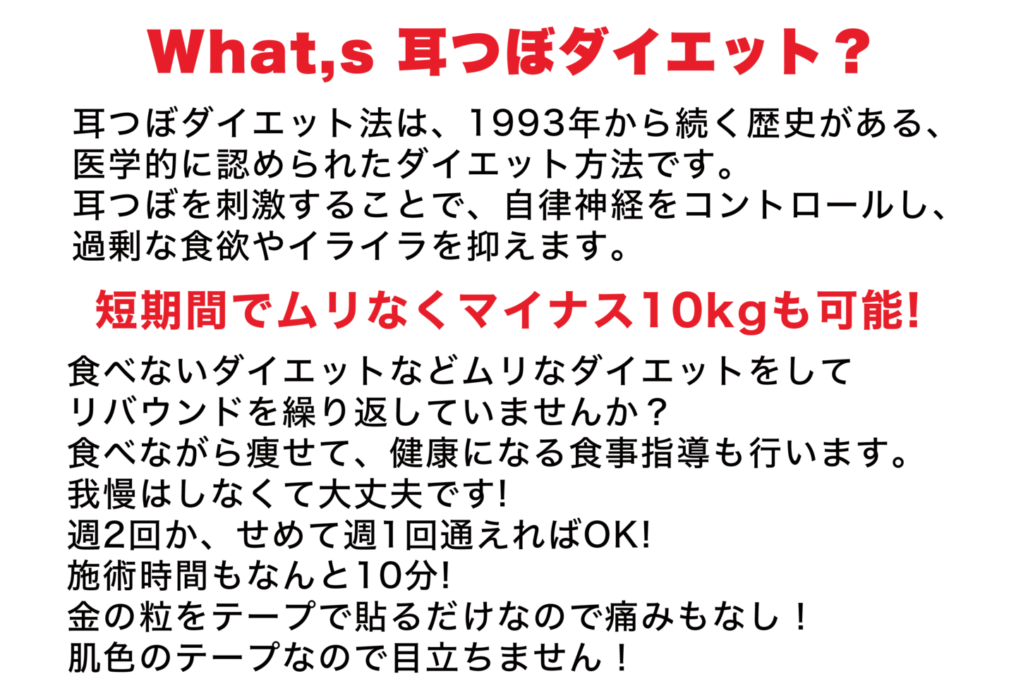 「食事制限なし!」「無理な運動なし!」「リバウンドなし!」耳つぼにはダイエット効果があるツボが存在します!